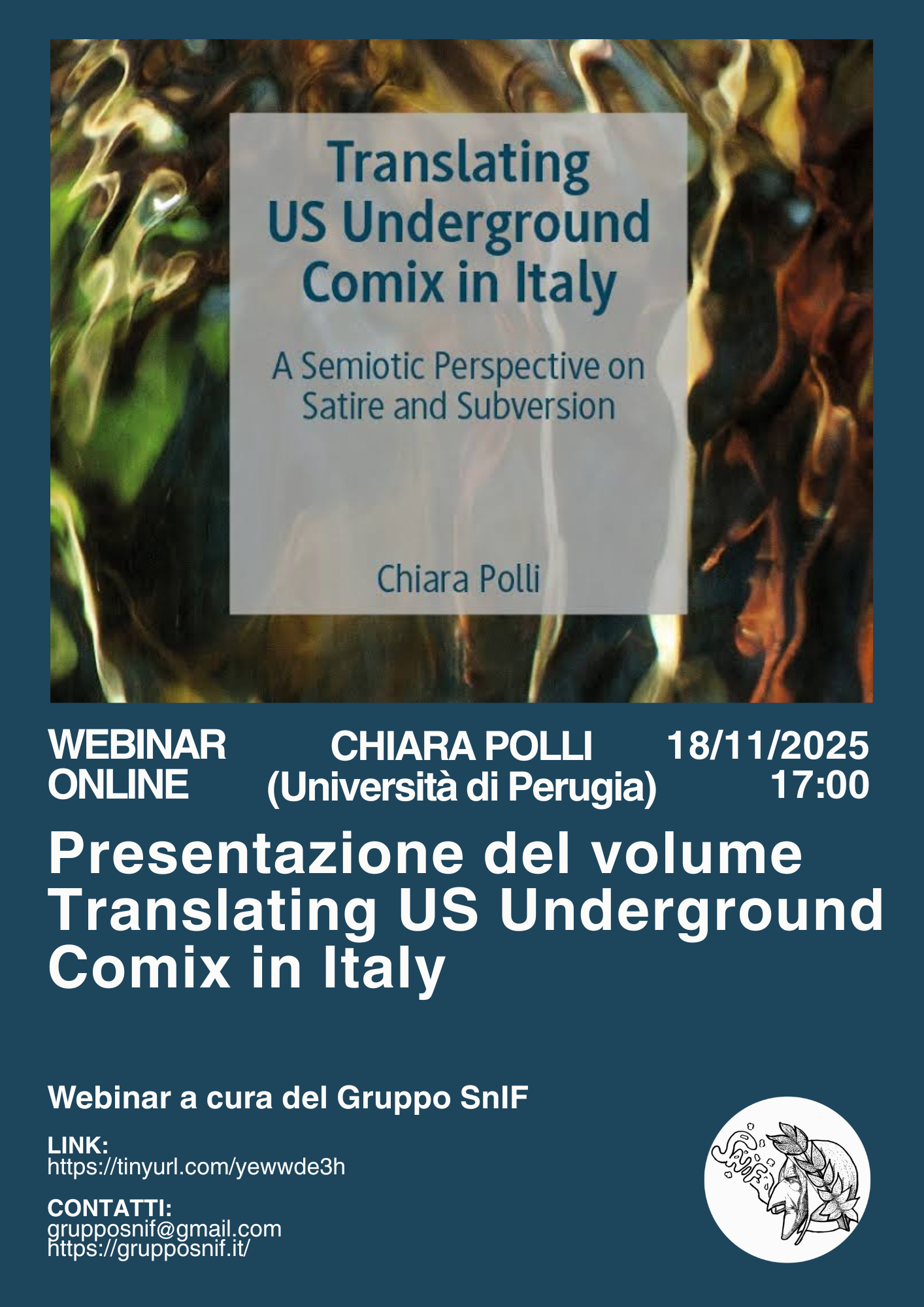Martedì 18 novembre, alle ore 17, avrà luogo il prossimo webinar organizzato dal gruppo SnIF. L’incontro avrà come ospite Chiara Polli (Università di Perugia), che presenterà il suo volume “Translating US Underground Comix in Italy”, edito da Springer (link).